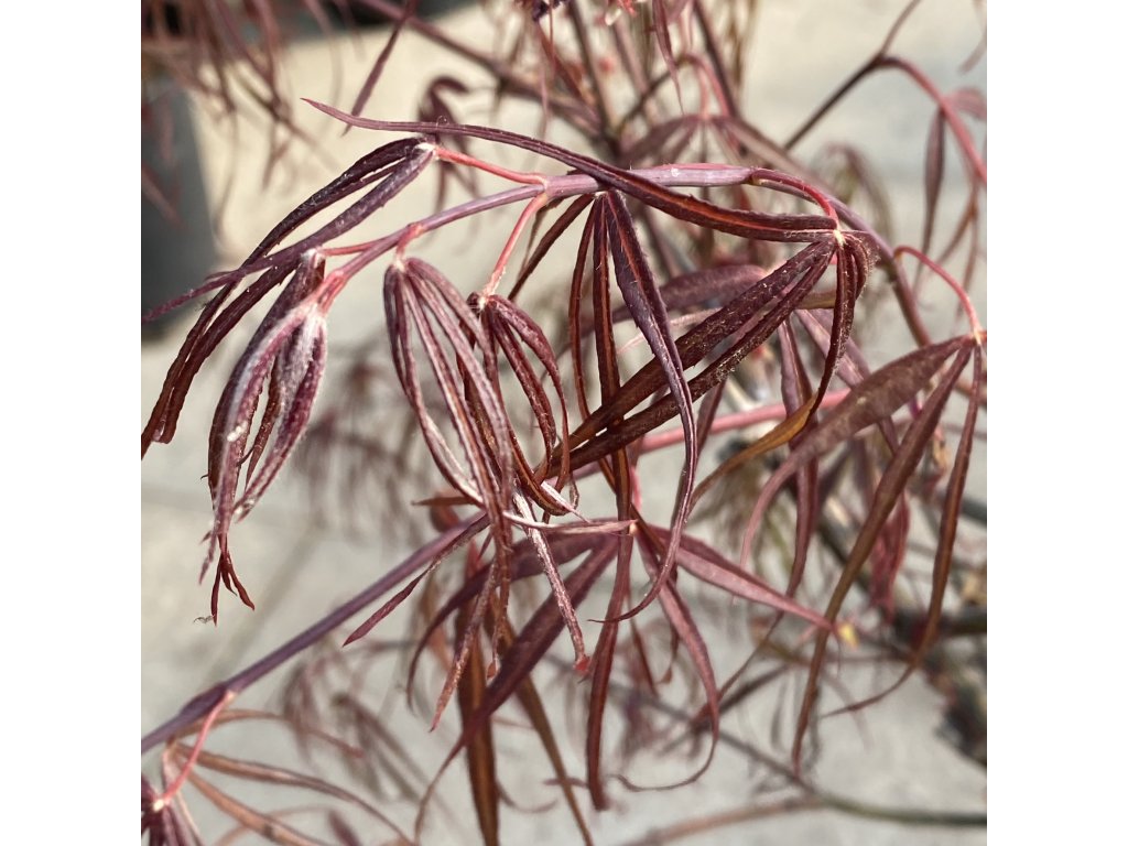 Opadavý okrasný javor s jemně úzkými, „pavoučkovitými“ červenými listy, které tvoří jemnou, krajkovitou strukturu koruny. Na jaře se listy objevují jasně červené, během léta mohou zůstat sytě červené až tmavší červené a na podzim přecházejí do zářivě karmínové až šarlatové barvy, což zvyšuje jejich dekorativní efekt. V dospělosti může dosáhnout přibližně 3–4 m výšky a 2,5–3 m šířky po 10–15 letech růstu, s vztyčeným a elegantním tvarem koruny, která nepůsobí mohutně. Výrazná červená barva listů během celé sezóny a jejich jemná textura dělají z tohoto javoru oblíbený prvek pro dekorativní zahrady a menší prostory.