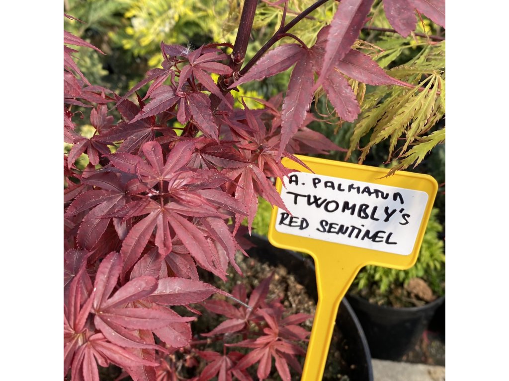 Acer palmatum 'Twombly's Red Sentinel' je atraktivní kultivar javoru dlanitolitého s výrazně vzpřímeným růstem. Tento javor dorůstá výšky 3-4 m a šířky 1-1,5 m, což z něj činí ideální volbu pro menší zahrady nebo jako výrazný solitér. Vyniká nápadným červeným zbarvením listů, které se udržuje po celou sezónu a na podzim se ještě zintenzivňuje do sytě purpurových odstínů.