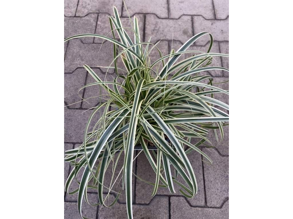Nízká, stálezelená okrasná tráva (ostřice) s jemnými, převislými listy, které vytvářejí husté, měkké a dekorativní trsy. Listy jsou tmavě zelené s krémově bílými okraji, což působí jako výrazný kontrast a přidává zahradě světlo a strukturální zajímavost. V dospělosti dorůstá přibližně 30–45 cm výšky a 45–60 cm šířky, takže je ideální pro střední až nízké výsadby. Během jara a léta se mohou objevit malé nenápadné květy, i když nejsou hlavní ozdobou rostliny. Atraktivní díky jemné textuře a nepřetržitému zelenému vzhledu s variegací listů, ideální pro zahrady s elegancí a strukturou.
