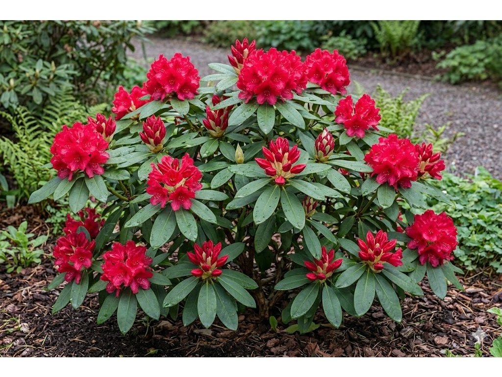 Rhododendron ’Markeeta’s Prize’ je stálezelený rododendronový keř s výraznými červenými květy, které pokrývají rostlinu v pozdní jarní sezóně (obvykle v květnu) a vytvářejí působivý barevný prvek v záhonu či okrasné výsadbě. Květy jsou velké, trubkovité až nálevkovité a často s tmavším označením u hrdla, což podtrhuje jejich intenzivní barvu a ornamentální hodnotu. Listy jsou tmavě zelené, lesklé a stálezelené, poskytují rostlině atraktivní vzhled po celý rok a kontrast k bohatému kvetení. ’Markeeta’s Prize’ je považován za silně rostoucí a robustní hybridní rododendron vhodný pro různá zahradní stanoviště.