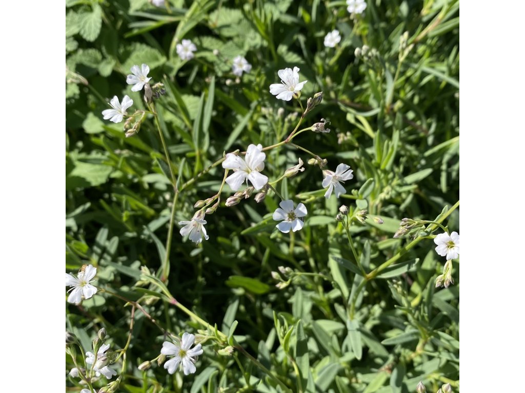 Gypsophila repens - šáter plazivý je půvabná kobercovitě rostoucí trvalka, ideální pro skalky, zídky, nádoby a okraje záhonů. Dorůstá výšky pouze 10-15 cm, což z ní činí perfektní volbu pro menší prostory. Bílé květy, objevující se od května do června, vytvářejí nádherný kontrast s jemnými, šedozelenými listy.