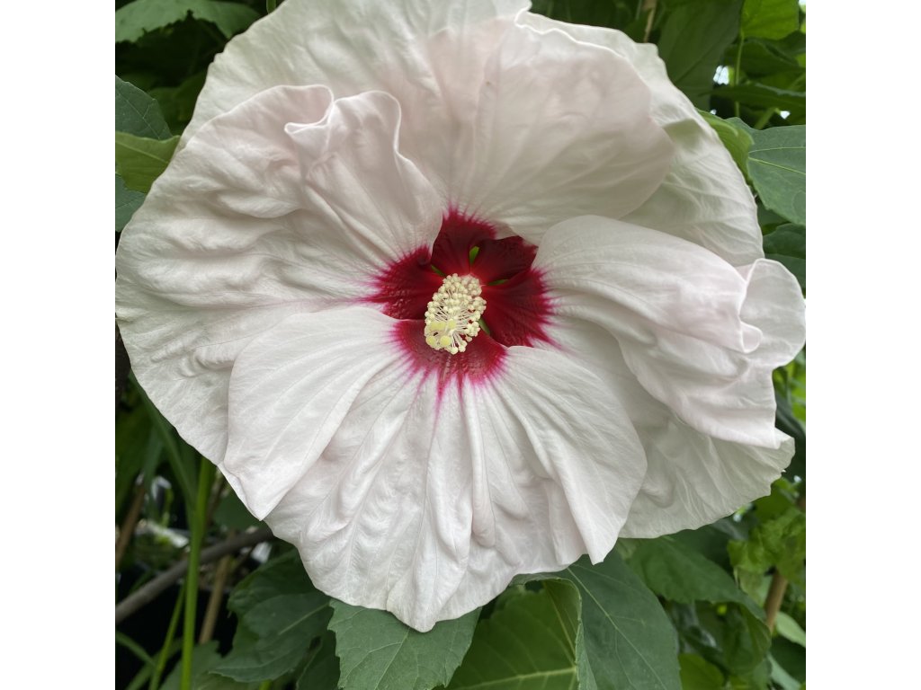 Hibiscus moscheutos 'Cherry Cheesecake' - ibišek bahenní je nádherná trvalka, která zaujme svými velkými, nápadnými květy. Dorůstá výšky 1-1,5 m a šířky 0,9-1,2 m. Kvete od července do září působivými květy o průměru až 25 cm v bílo-růžové barvě s výrazným tmavě červeným středem.