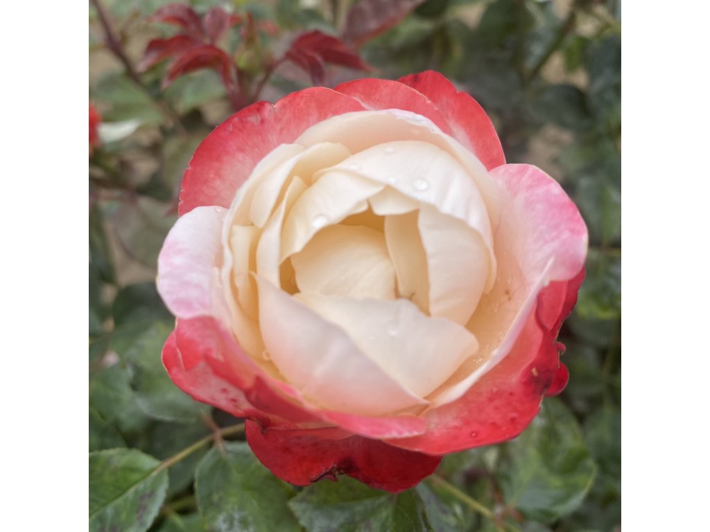 Nádherná velkokvětá růže s okouzlujícími dvoubarevnými květy. Okvětní plátky jsou bílé s výrazným červeným lemem, což vytváří působivý kontrast. Květy jsou plné, bohatě plnokvěté a intenzivně voní. Rostlina dorůstá výšky kolem 80 cm a je ideální pro záhony nebo jako solitéra.