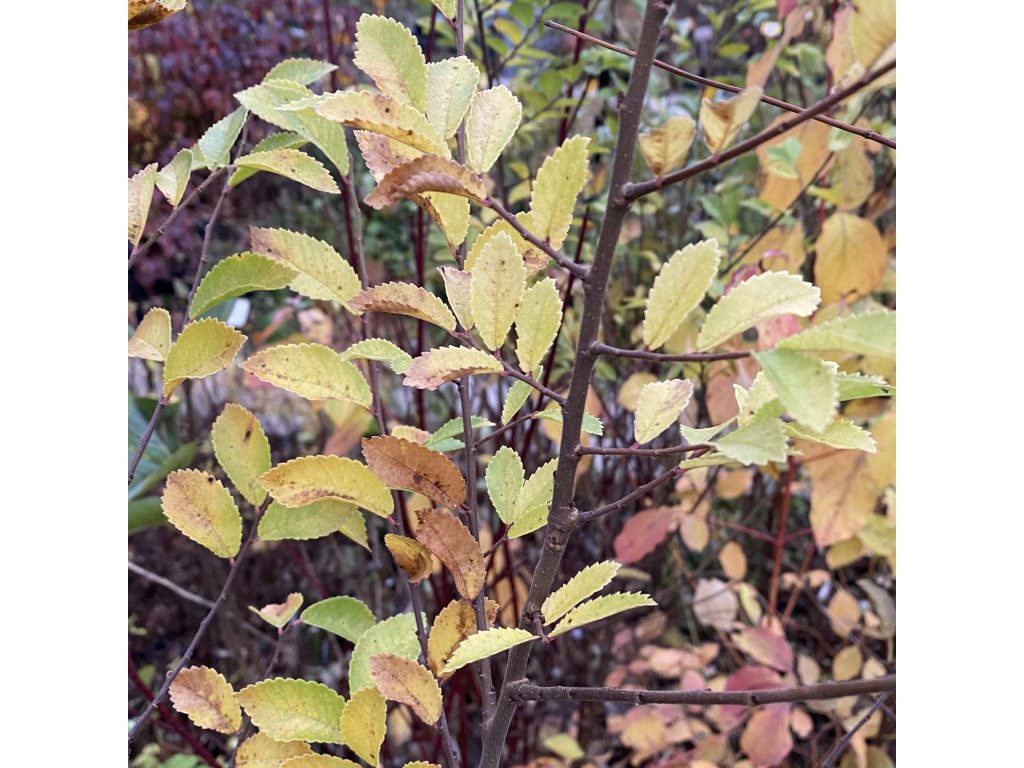 Ulmus parvifolia 'Corticosa' - jilm čínský je atraktivní opadavý strom nebo keř s jedinečnou kůrou, která se odlupuje v tenkých plátech, odhalujíc zajímavou barevnou mozaiku. Dorůstá výšky 3-5 metrů a šířky 2-3 metry, což z něj činí ideální volbu pro menší zahrady nebo jako solitéru.