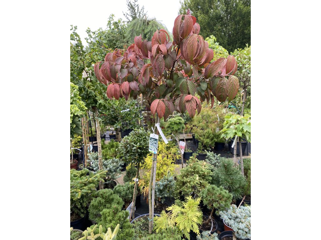 Viburnum plicatum 'Mariesii' kmínek - kalina japonská je menší stromek s korunkou dorůstající do výšky i šířky 1,5-2 m. Tato odrůda se vyznačuje typickými vodorovně a patrovitě odstávajícími větvemi, což jí dodává zajímavý architektonický vzhled. Kalina bohatě kvete v květnu až červnu, kdy se objevují plochá bílá květenství o průměru až 15 cm. Rostlina preferuje dobře propustné, vlhké půdy bohaté na živiny. Daří se jí na slunečných stanovištích i v lehkém přistínění. Velikost a hustotu korunky lze snadno regulovat řezem, který je nejlepší provádět ihned po odkvětu. Tento atraktivní stromek je ideální jako solitéra do menších zahrad nebo jako součást smíšených výsadeb, kde vynikne její elegantní habitus a výrazné kvetení.